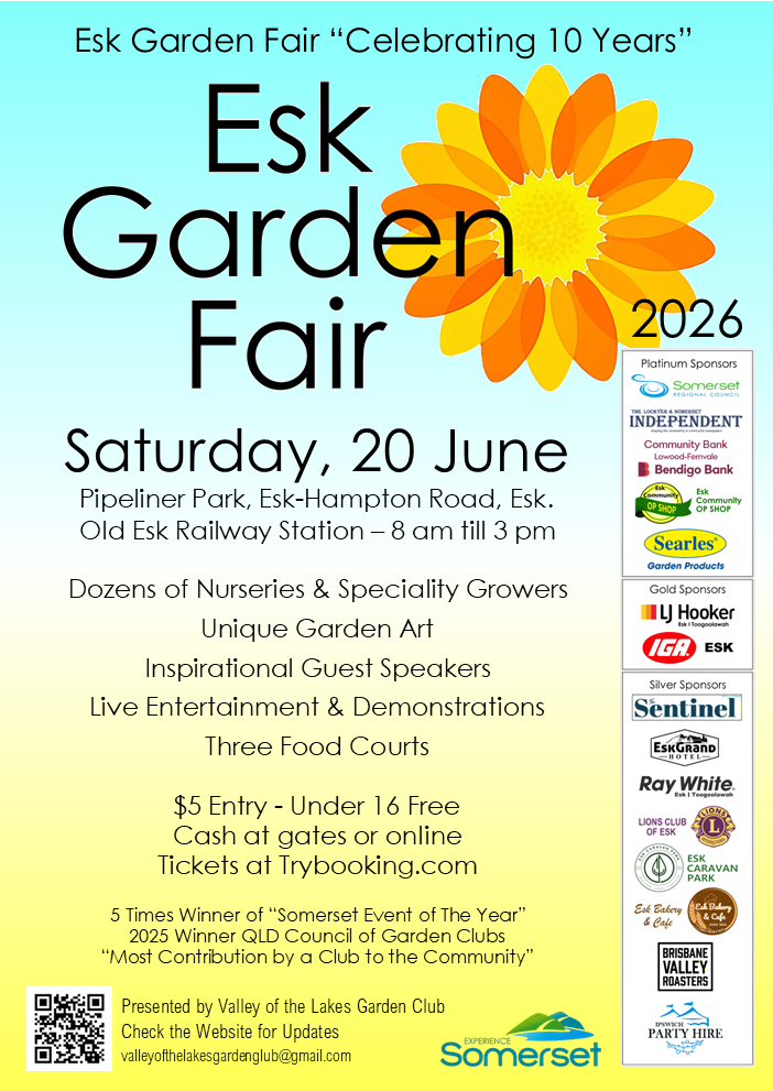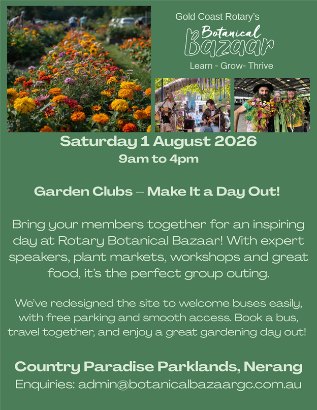 The 2026 calendar shows the events planned for garden clubs in Queensland on a monthly basis. As clubs decide on the exact date and flyers are produced. The details can then be sent to the webmaster. The webmaster will then update the events. If clubs think there will be a clash then the clubs can send requests for information to the likely event holders and to those clubs who have not registered the club's event date. Every attempt will be made to keep this calendar up to date. The webmaster does not accept any responsibility for the information contained on this web site as all information is gathered on a voluntary basis.